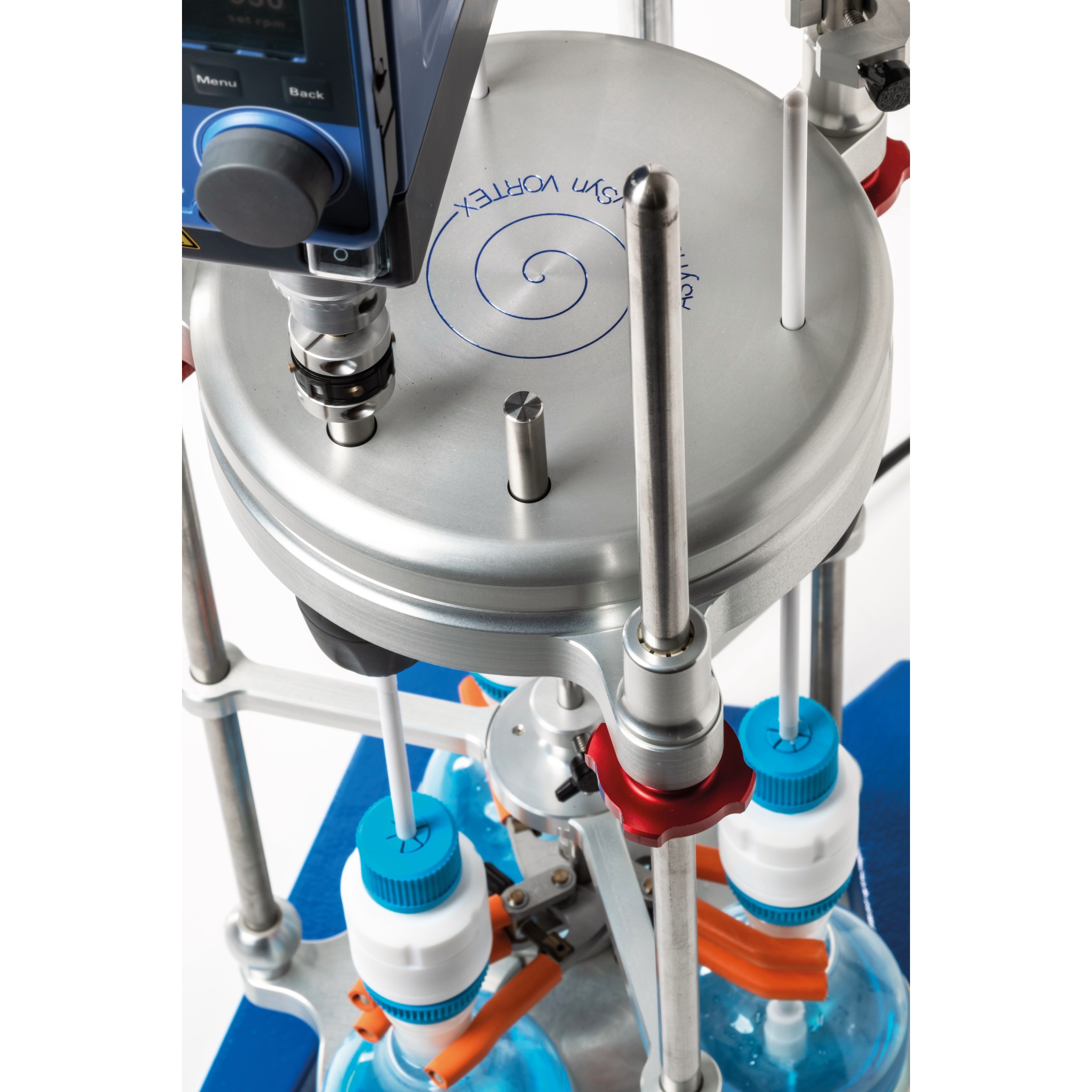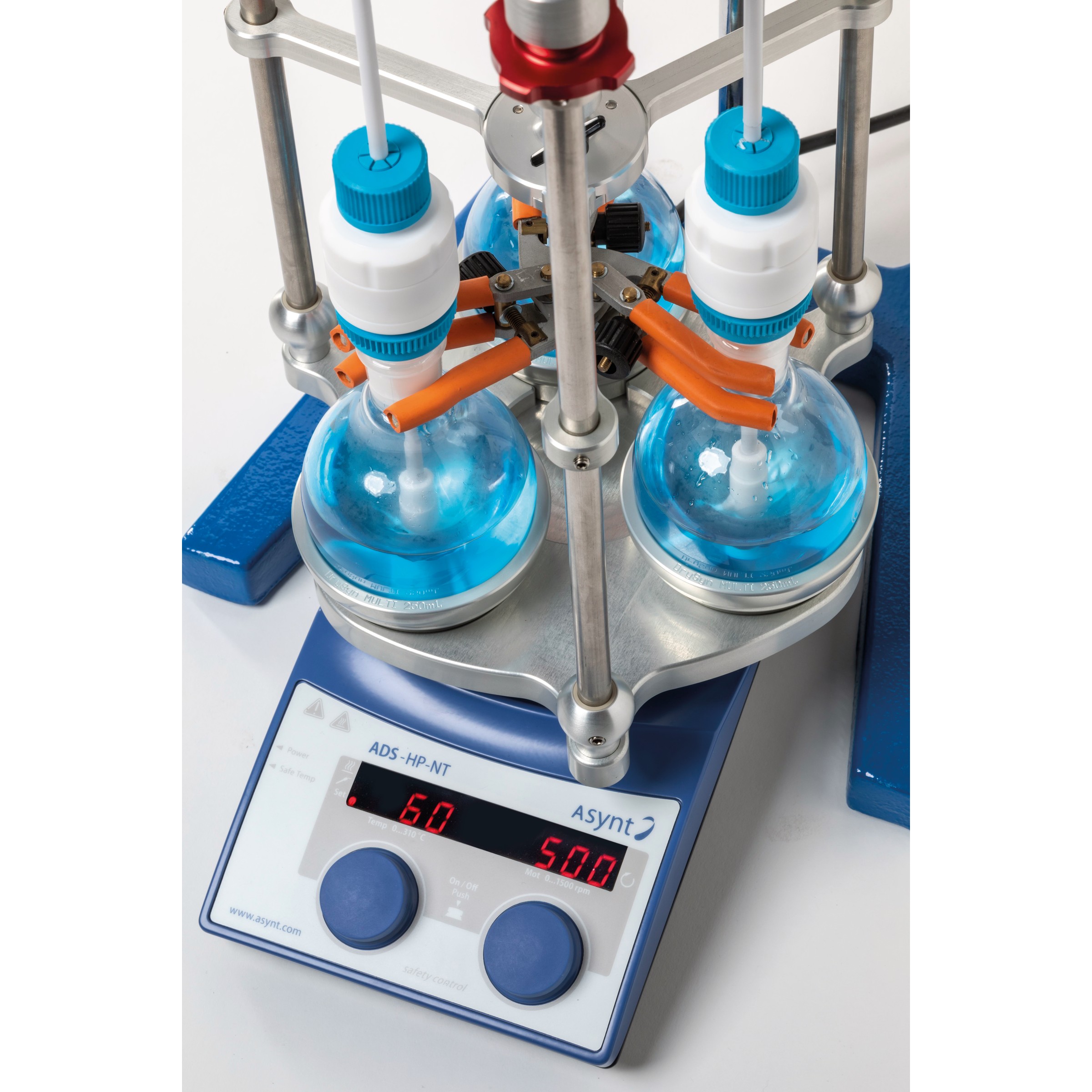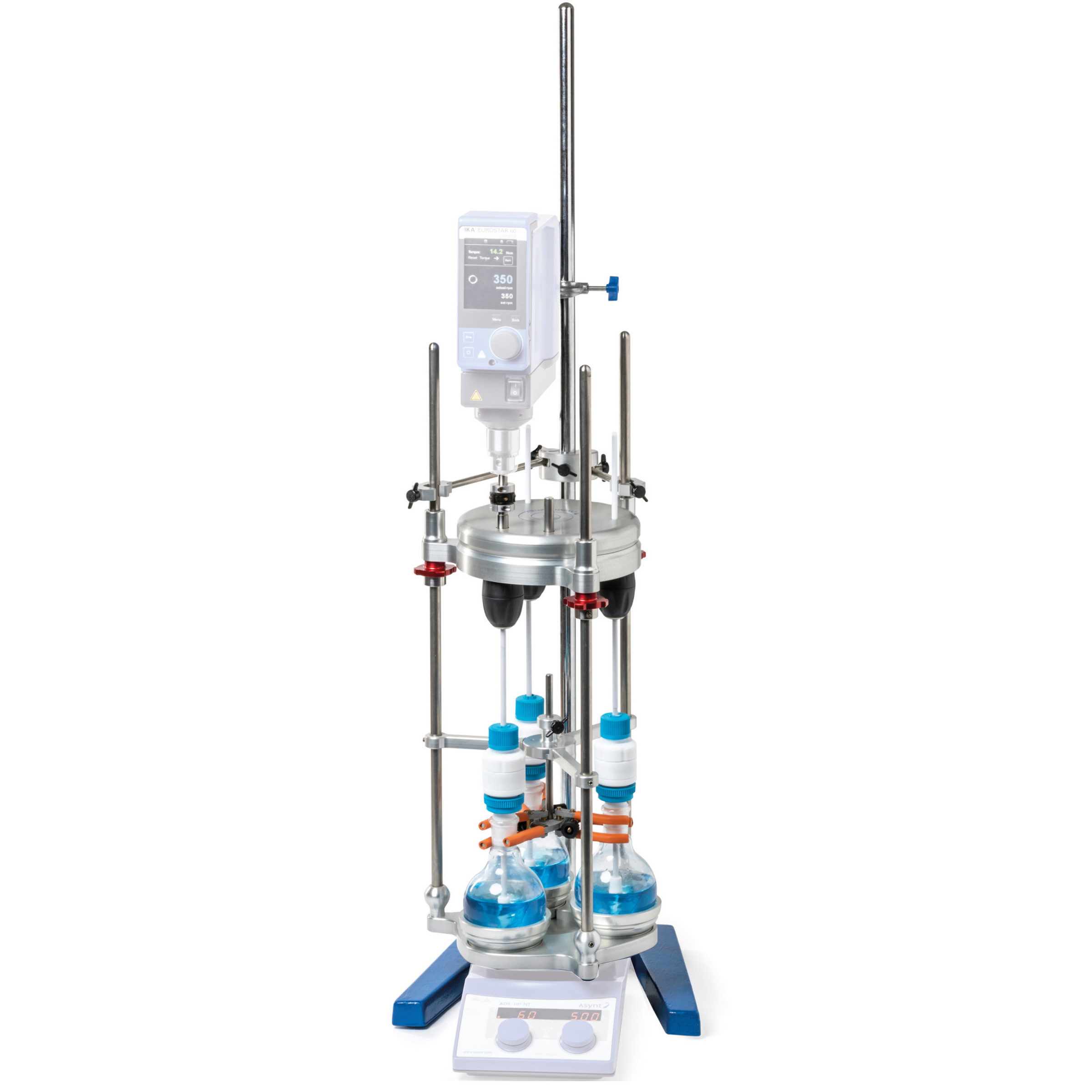 Agitation de liquides visqueux.Un seul agitateur à hélice pour agiter 3 ballons de 500 ml maximum.