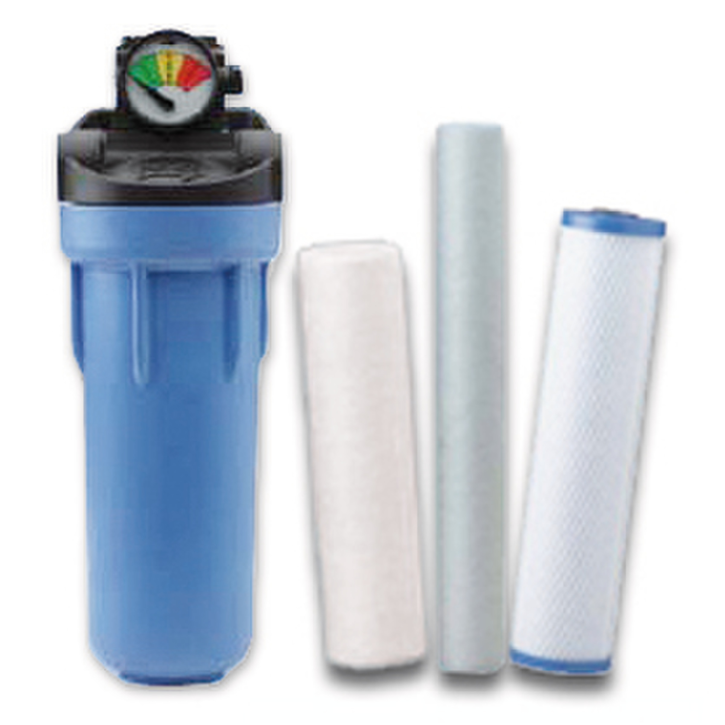 Corps de filtre 10" (20" sur demande) cuve bleue ou transparente, avec ou sans manomètre, avec vanne de purge et support mural. A compléter par cartouche interchangeable longueur 10", et mamelon 3/4" PVC (et éventuellement raccords en polyéthylène R3/4"). Cartouche anti-sédiments: recommandée pour adoucisseur. Cartouche à membrane nylon filtrante 0,2µm pour rétention des micro-organismes. Autoclavable de nombreuses fois. Cartouche filtrante 1 ou 5 µm bobinée en polypropylène. Cartouche à charbon actif: élimination du chlore et dérivés, pesticides, matières organiques, colloïdes, goût et odeurs. Cartouche stabilisatrice de dureté.