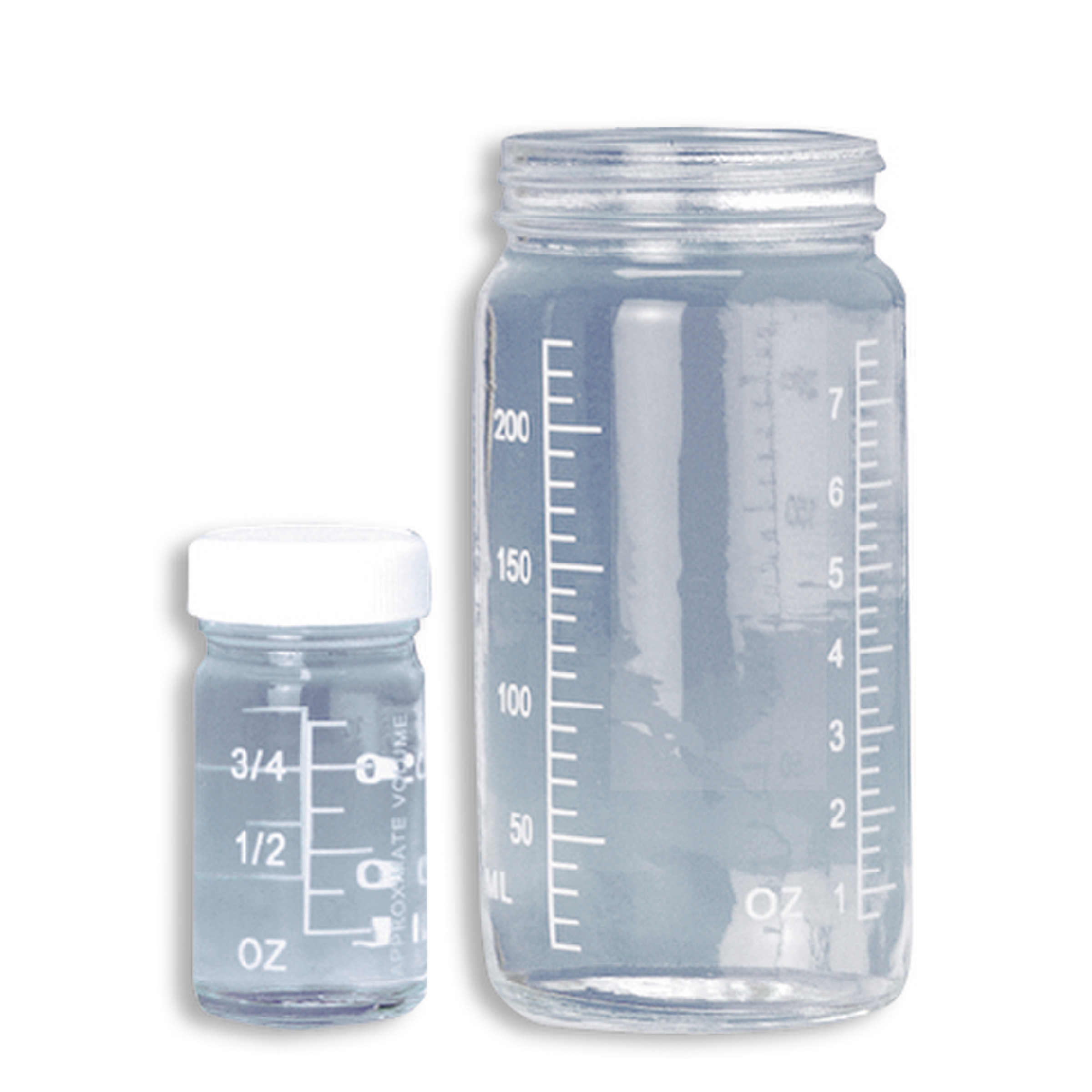 Bouteilles graduées à col large en verre de chimie haute résistance.