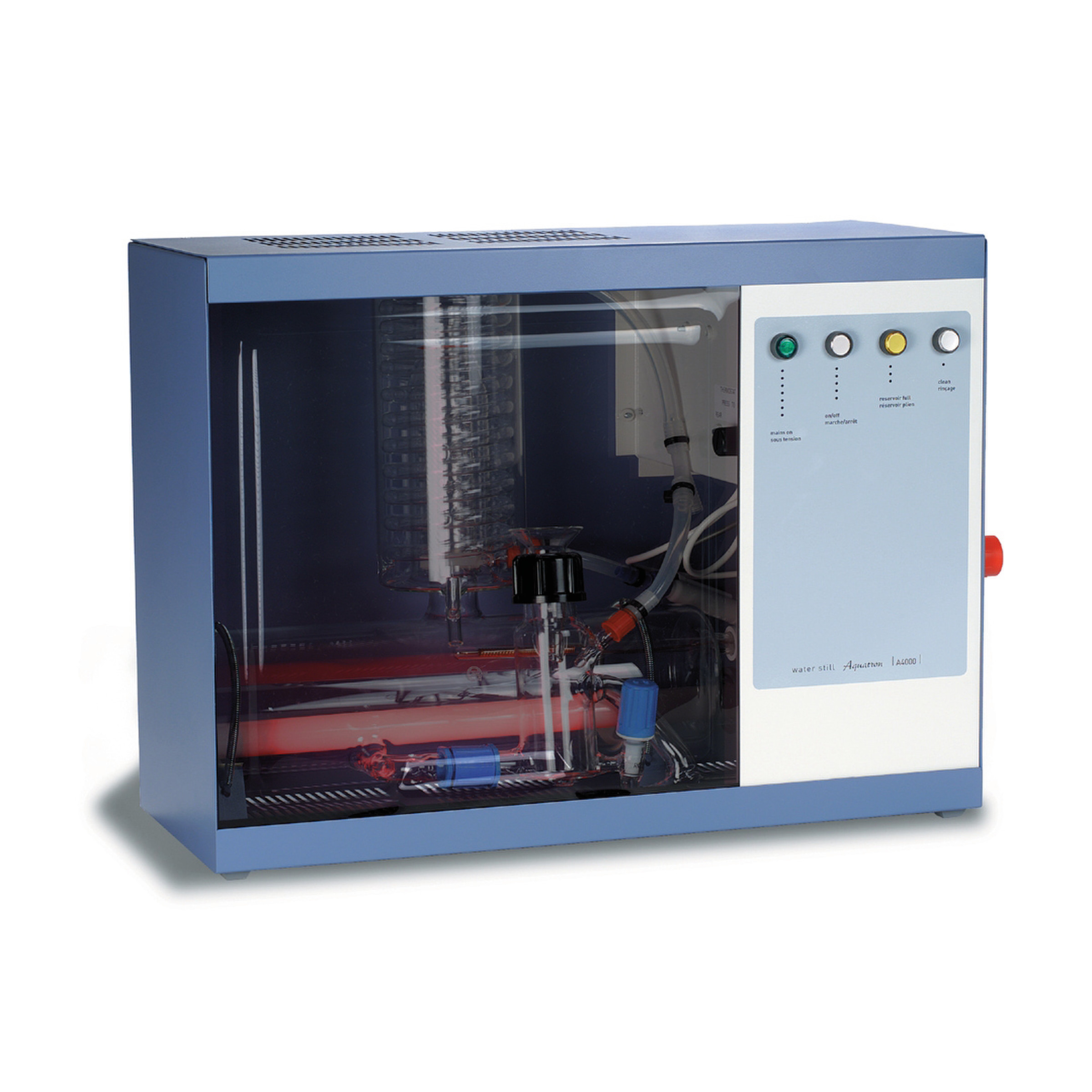 Totalement autonomes avec contrôle de niveau d'eau dans le réservoir. Fonctionnement automatique avec gestion des alimentations en eau et électricité.Bouilleur et réfrigérant à double serpentin en verre Pyrex®.