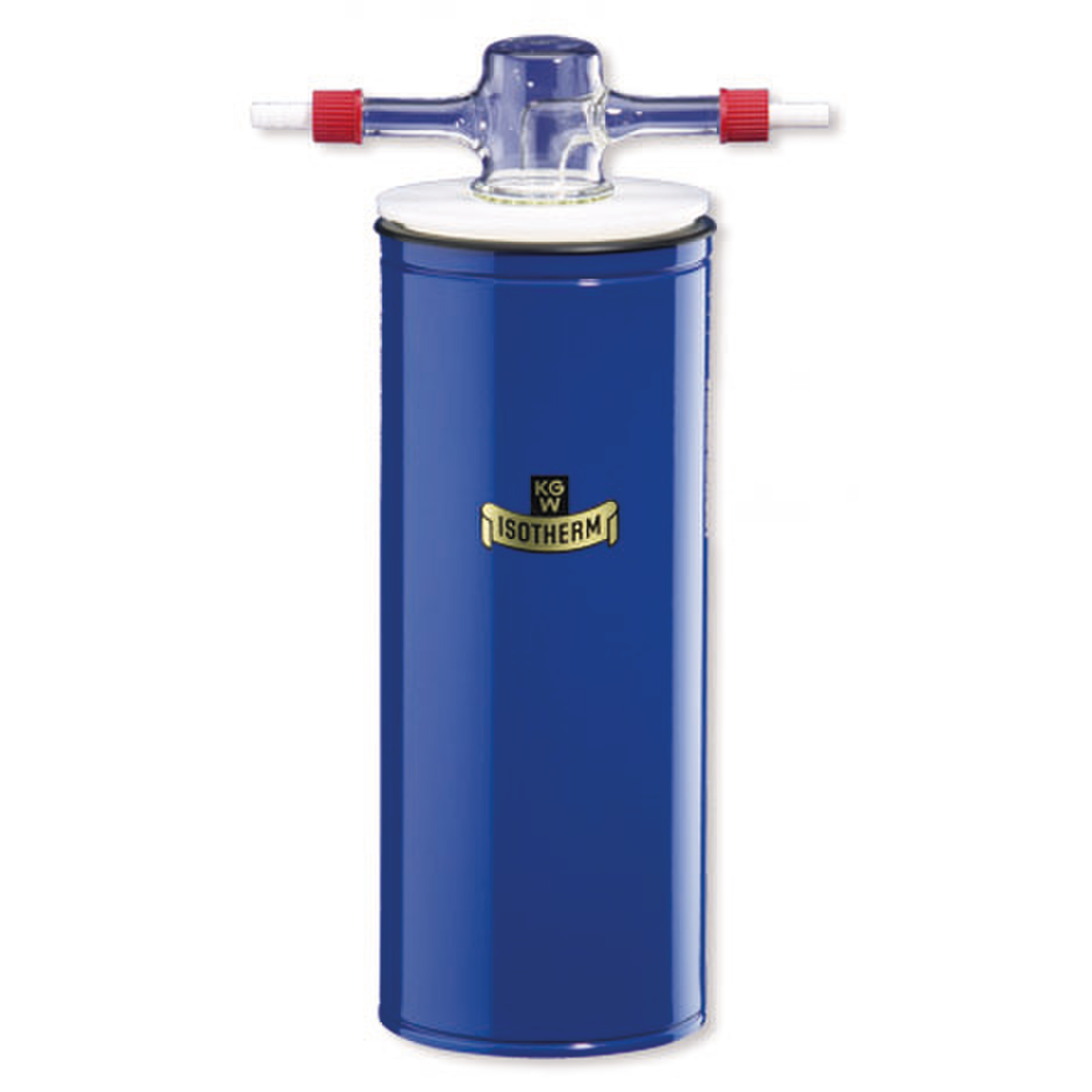 Vase dewar en verre borosilicaté argenté avec enveloppe en acier laqué bleu.