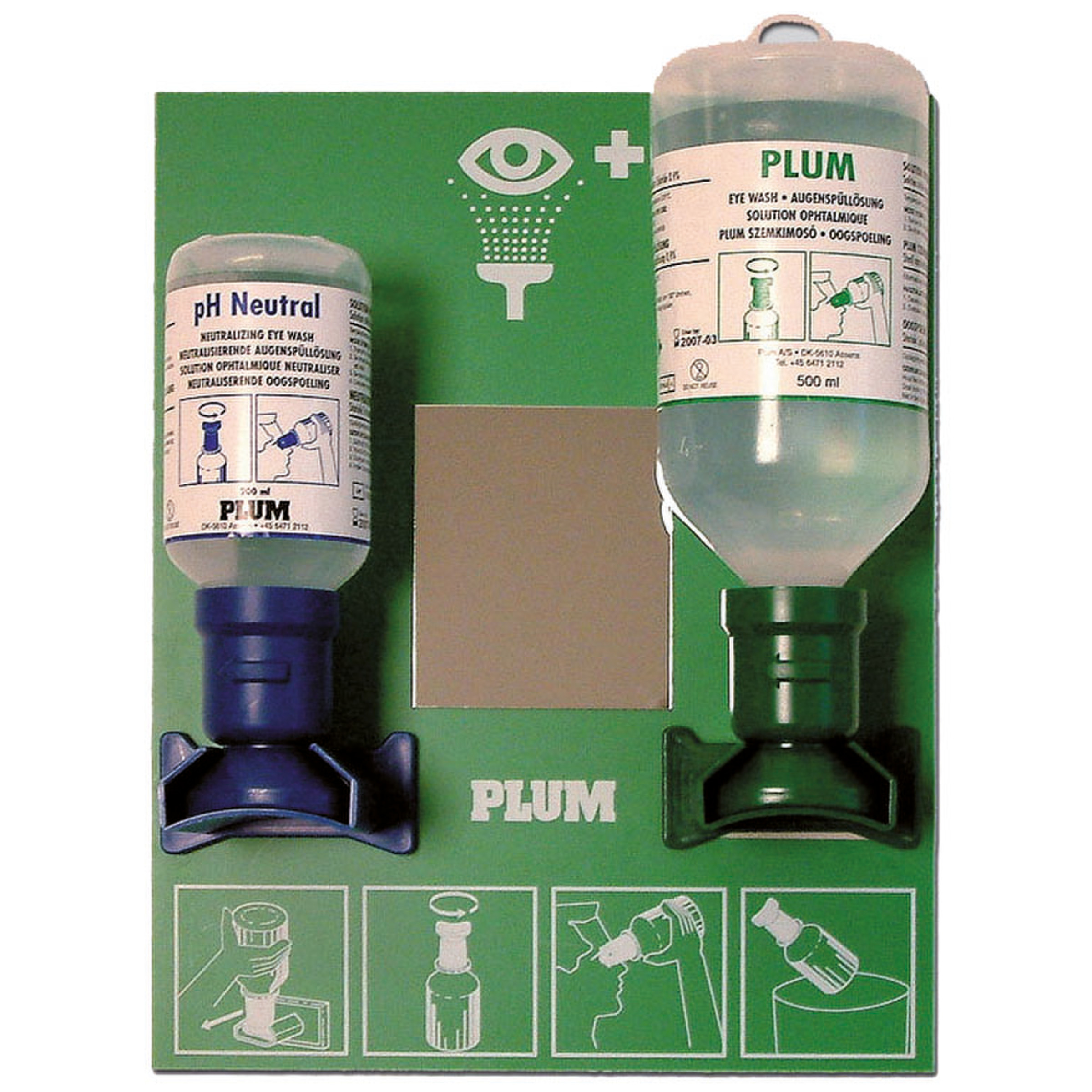 Station murale de lavage oculaire contenant 1 flacon de 500 ml de solution stérile de chlorure de sodium à 0,9% pour le rinçage des yeux contaminés par des corps étrangers et 1 flacon de 200 ml de pH Neutral, solution tampon phosphate à 4,9% stérile (pH neutre) neutralisant rapidement les projections d'acides et bases sur les yeux et le corps.