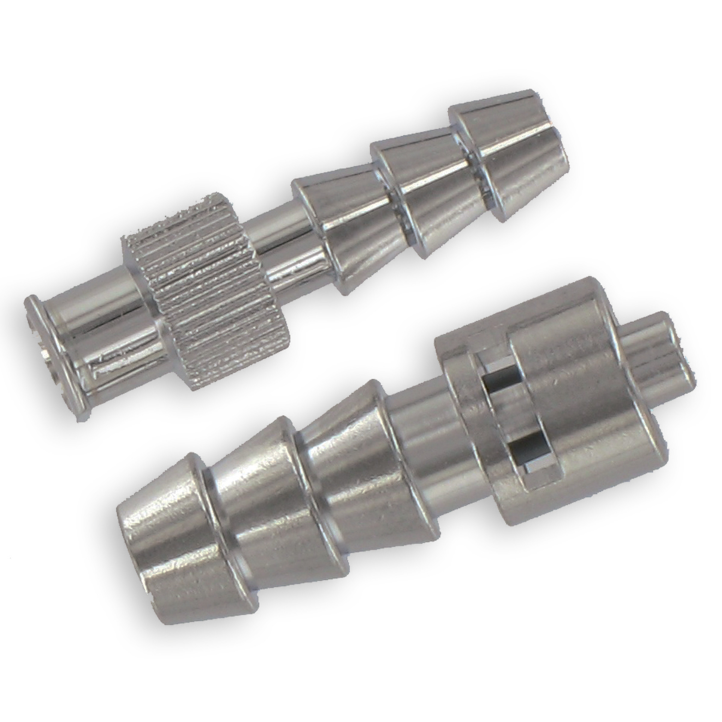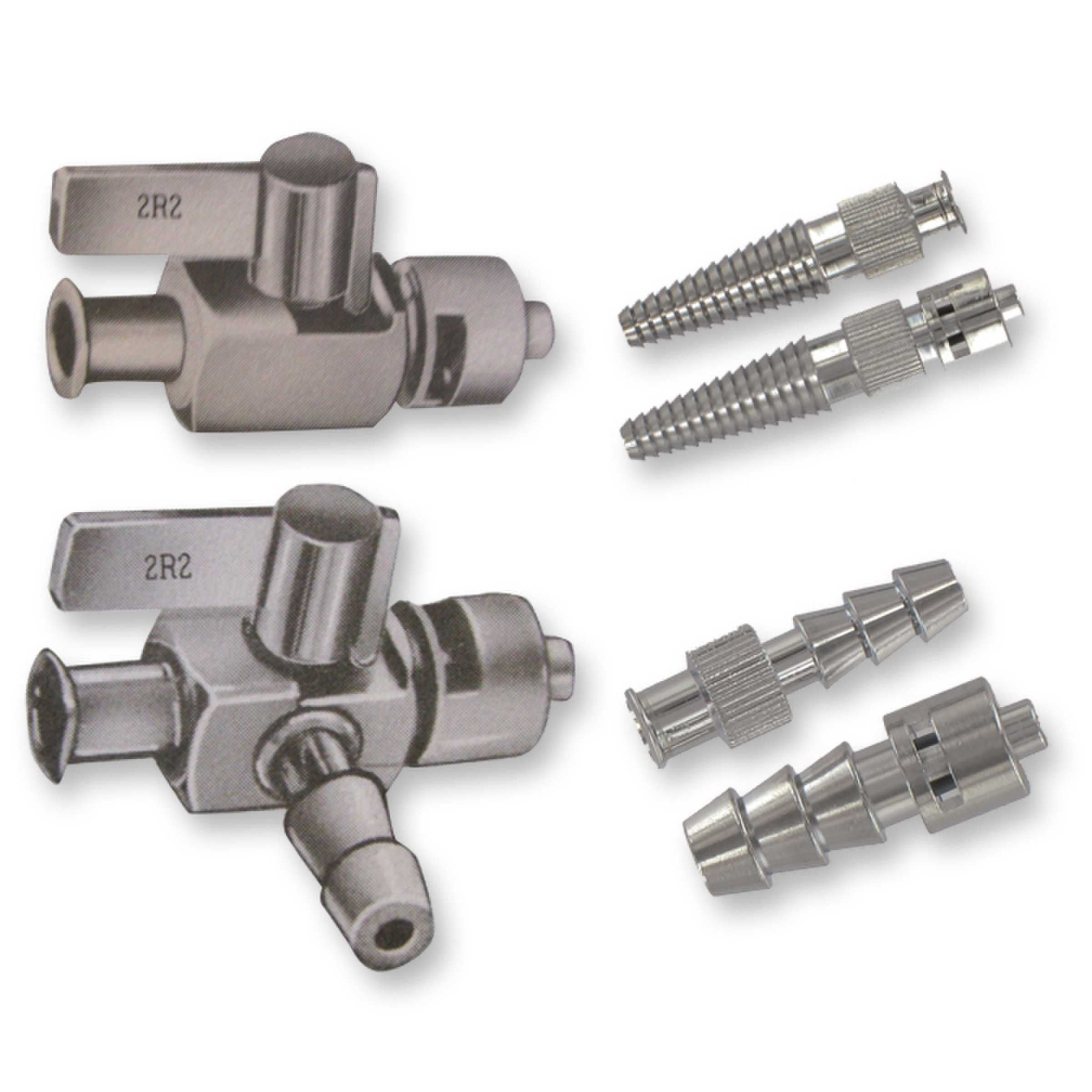 Raccords simples ou à robinet en laiton nickelé, munis de tétines permettant le montage de tuyaux ou de raccords Luer Lock mâles ou femelles.